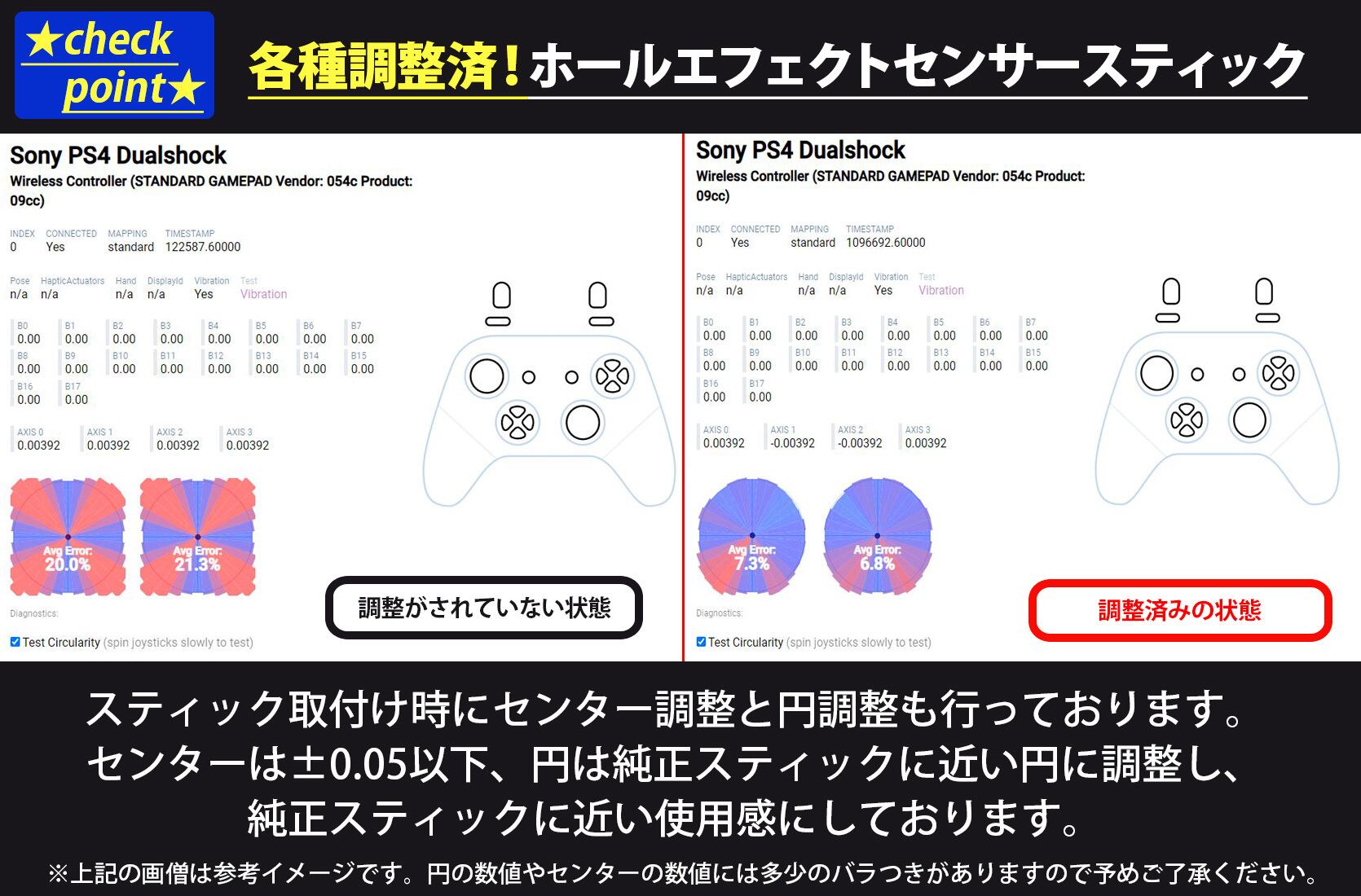 スティックは取付け時にGamepad Testerで触っていない状態の値が中心から±0.05以下へ調整し、スティックの検知範囲も純正スティックの円に近い状態へ調整しております。